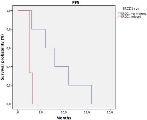 Progression free survival in CTC ERCC1+ve patients stratify for ERCC1 induction. median PFS of patients with ERCC1 induction was significantly shorter than that observed in patients with stable or reduced ERCC1 (2,7 months vs 8,8 months; HR: 0.2 IC95% 0.1-0.33, p 0.02).